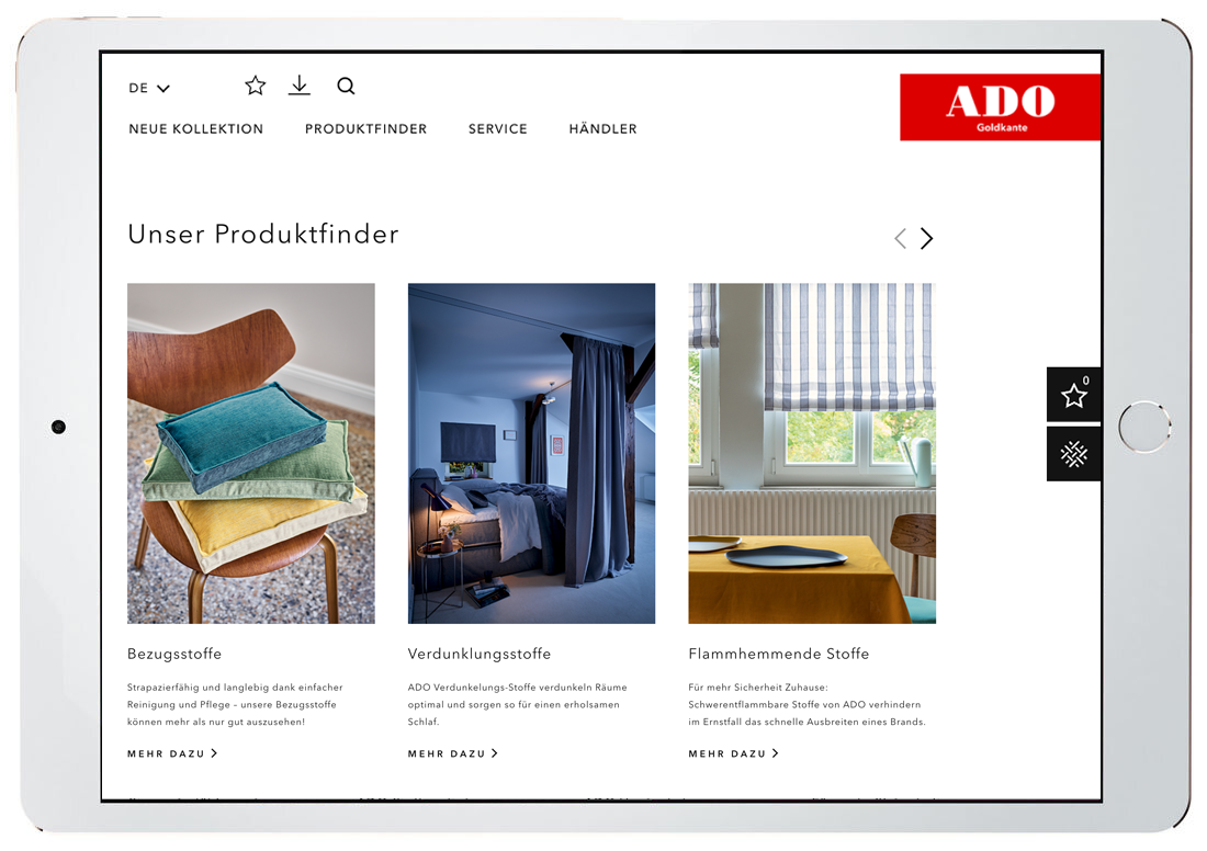 Leicht, harmonisch und pure Lebensfreude – mit Vorhängen, Gardinen und Stoffen für Polstermöbel steht die ADO Goldkante GmbH & Co. KG als deutscher Textilverlag seit 1954 für einen frischen, natürlichen Look und lebendige Designs.